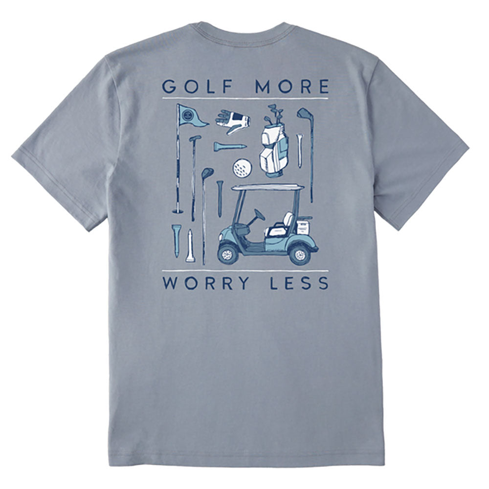 The Life Is Good Golf More Worry Less Men's T-Shirt encapsulates a carefree attitude combined with a passion for golf, making it an excellent choice for enthusiasts of the game. Crafted from a soft, breathable cotton blend, this shirt ensures comfort throughout the day, whether you're on the green or simply enjoying a casual day out.
