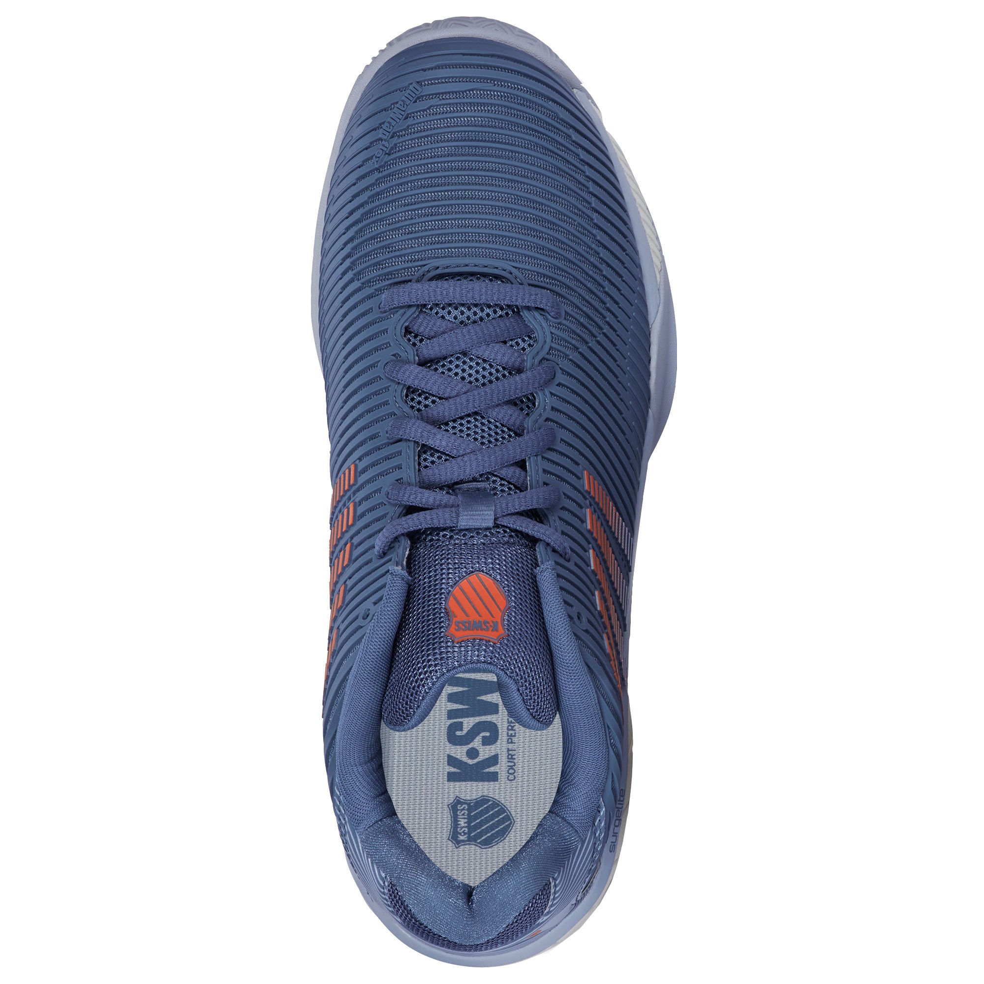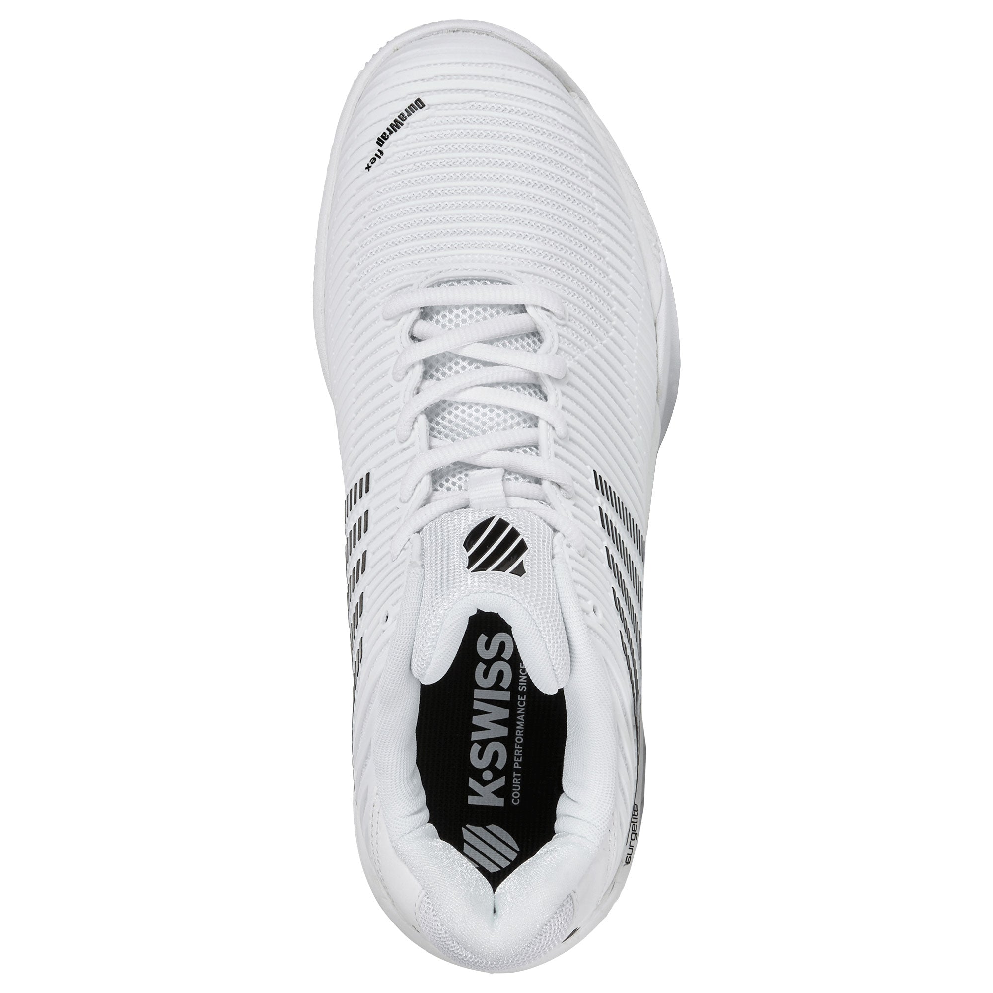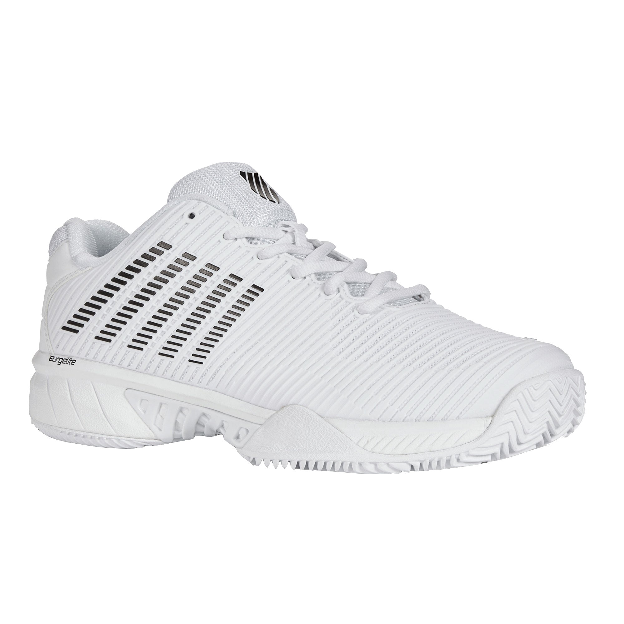 The K-Swiss Hypercourt Express 2 Junior is a lightweight, breathable tennis shoe engineered for junior competitors. Featuring Surgelite midsole for light, comfy cushioning, durable DuraWrap Flex support with no break-in, breathable Seamfree upper, - liner for moisture management, and Aosta 7.0 outsole for traction.