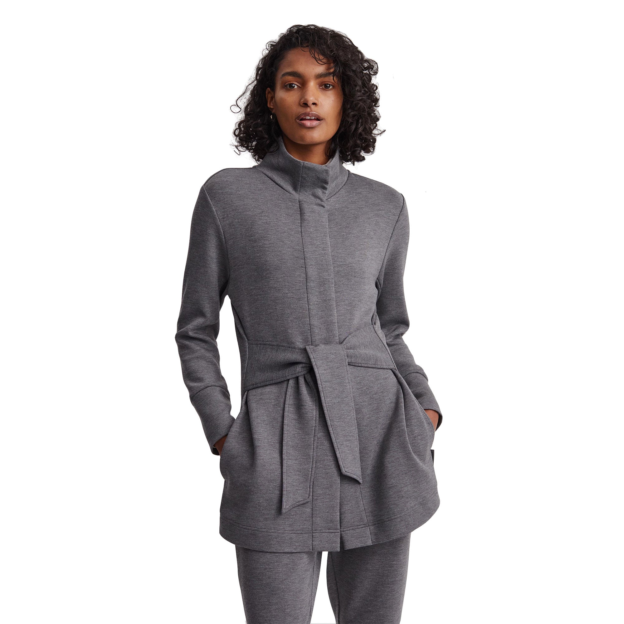 Take on any brisk morning with the Varley Anset Womens Wrap Jacket. Made for endless comfort, the soft blended fabric wraps you in warmth for any weekend errands, or simply relaxing on the patio. The versatile Anset Wrap Jacket can easily be dressed up or down, depending on the day, and the front wrap ties are paired with a regular fit deliver a more feminie silhouette.